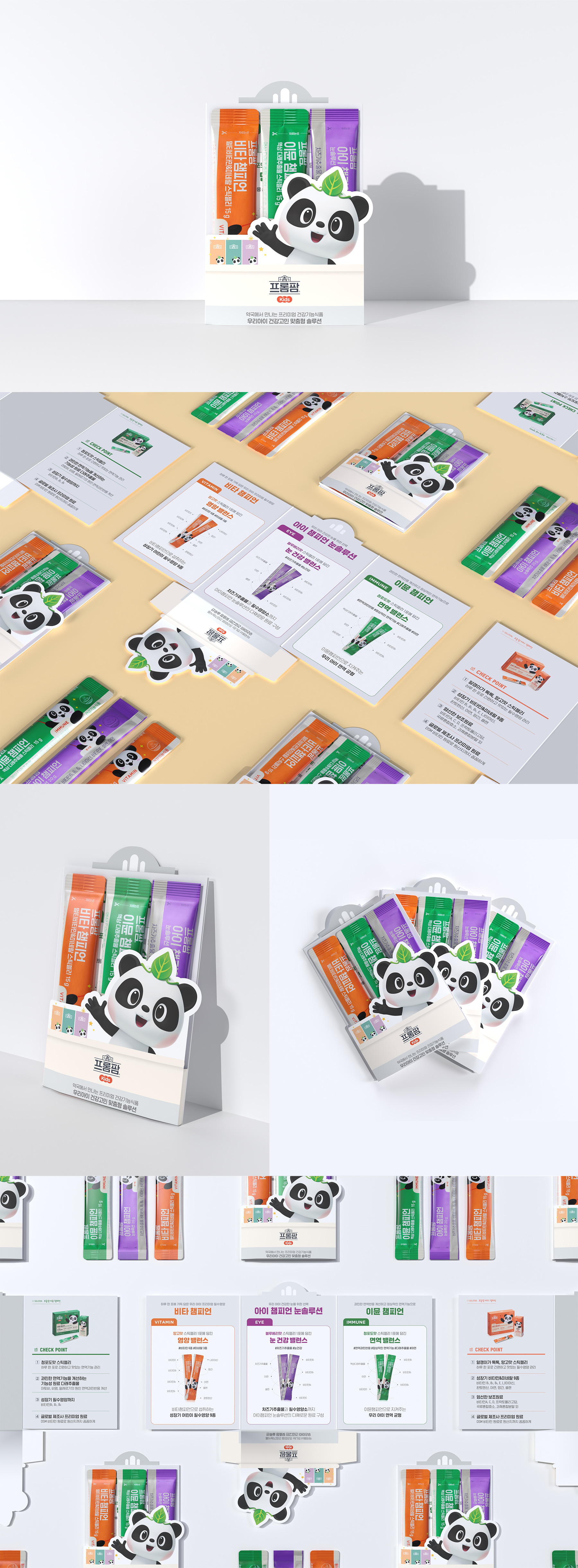 동아제약의 약국 전용 건강기능식품 브랜드 프롬팜(FROMPHARM) 키즈 라인 제품 소개를 위한 샘플 파우치 겸 리플렛을 제작했습니다. 비타챔피언, 이뮨챔피언, 아이챔피언 총 3종의 샘플을 함께 담을 수 있는 패키지 구조로 기획했습니다. 프롬팜 키즈 캐릭터 ‘판디(PANDI)’를 활용해 아이 친화적이고 친근한 디자인을 구현했습니다. 제품별 기능에 맞춰 컬러와 그래픽 요소를 구분해 직관적인 정보 전달이 가능하도록 구성했습니다. 약국 현장에서의 활용성과 브랜드 인지도를 동시에 고려한 키즈 전용 홍보 패키지 디자인입니다.