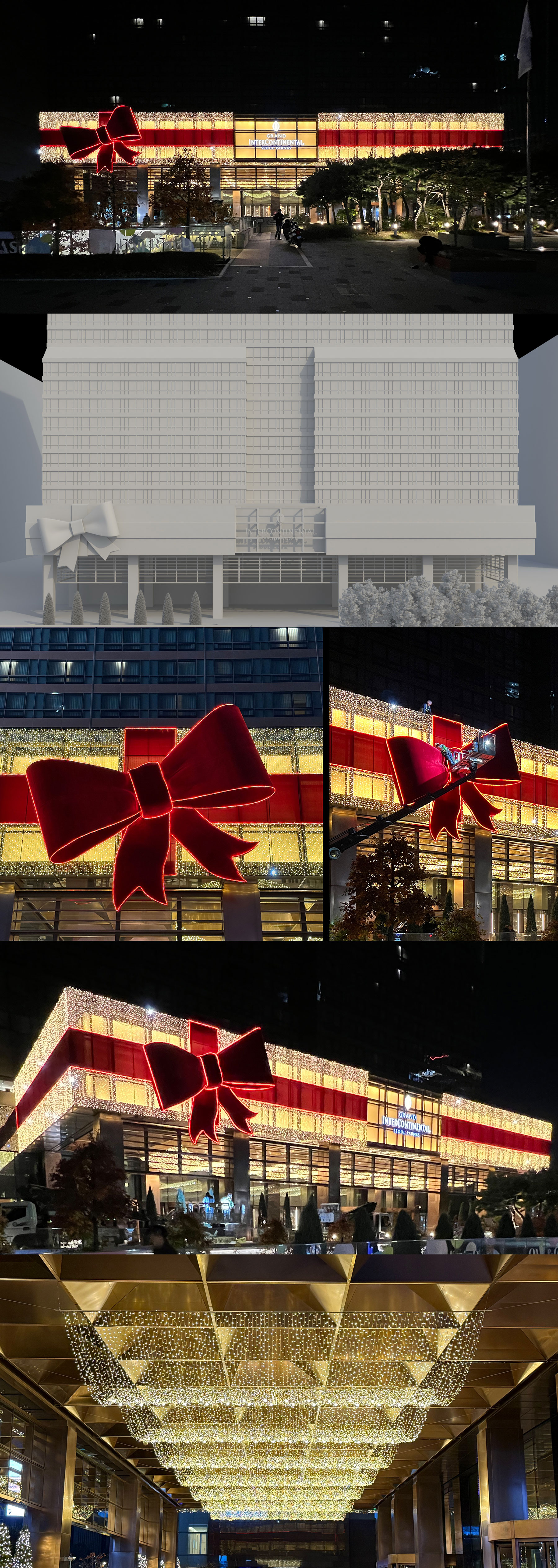 외관 조명 연출은 따뜻한 색온도의 라이팅을 중심으로 구성하여, 겨울 시즌의 포근한 분위기와 호텔 특유의 품격을 동시에 표현했습니다. 건물 전면에 균형감 있게 배치된 조명은 리본 오브제와 조화를 이루며, 거리와 주변 환경에서도 자연스럽게 어우러지는 야간 경관을 완성했습니다.