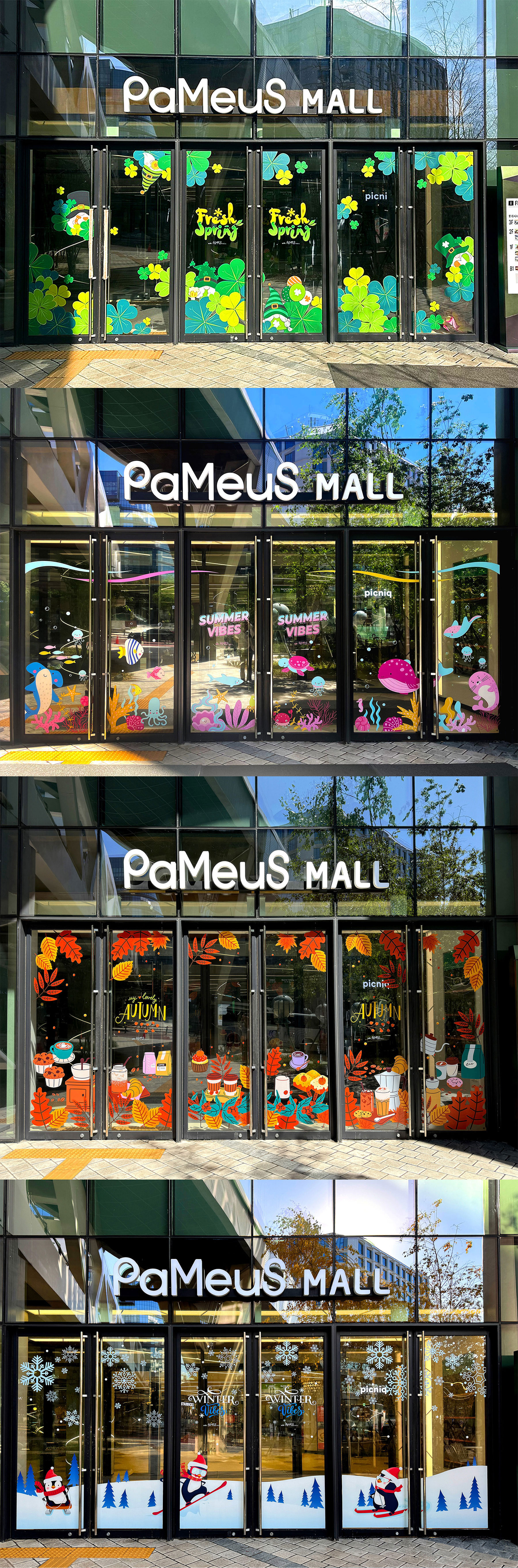 판교에 오픈한 복합문화공간 파미어스몰의 오픈부터 현재까지 시즌별, 이벤트별 키비주얼을 디자인하고 이를 바탕으로 한 VMD 연출을 진행하고 있습니다.